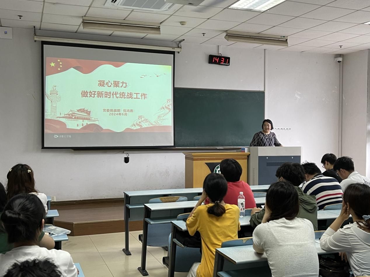 倪鸿燕以“凝心聚力 做好新时代统战工作”为主题,对高校统战工作作了细致深刻的讲述。她详细论述了党的统一战线所经历的历史发展阶段和如何做好新时代统战工作,细致讲解了统战工作的定义、统一战线的工作范围以及统一战线的五大关系,明确教育广大青年在新时代要以习近平新时代中国特色社会主义思想为指导,从政治高度认识统一战线的法宝作用,心怀“国之大者”,发扬斗争精神,树牢底线思维,增强工作本领,团结一切可以团结的力量,调动一切可以调动的积极因素,最大限度凝聚起共同奋斗的力量,努力为全面建设社会主义现代化国家、全面推进中华民族伟大复兴作出更大贡献。