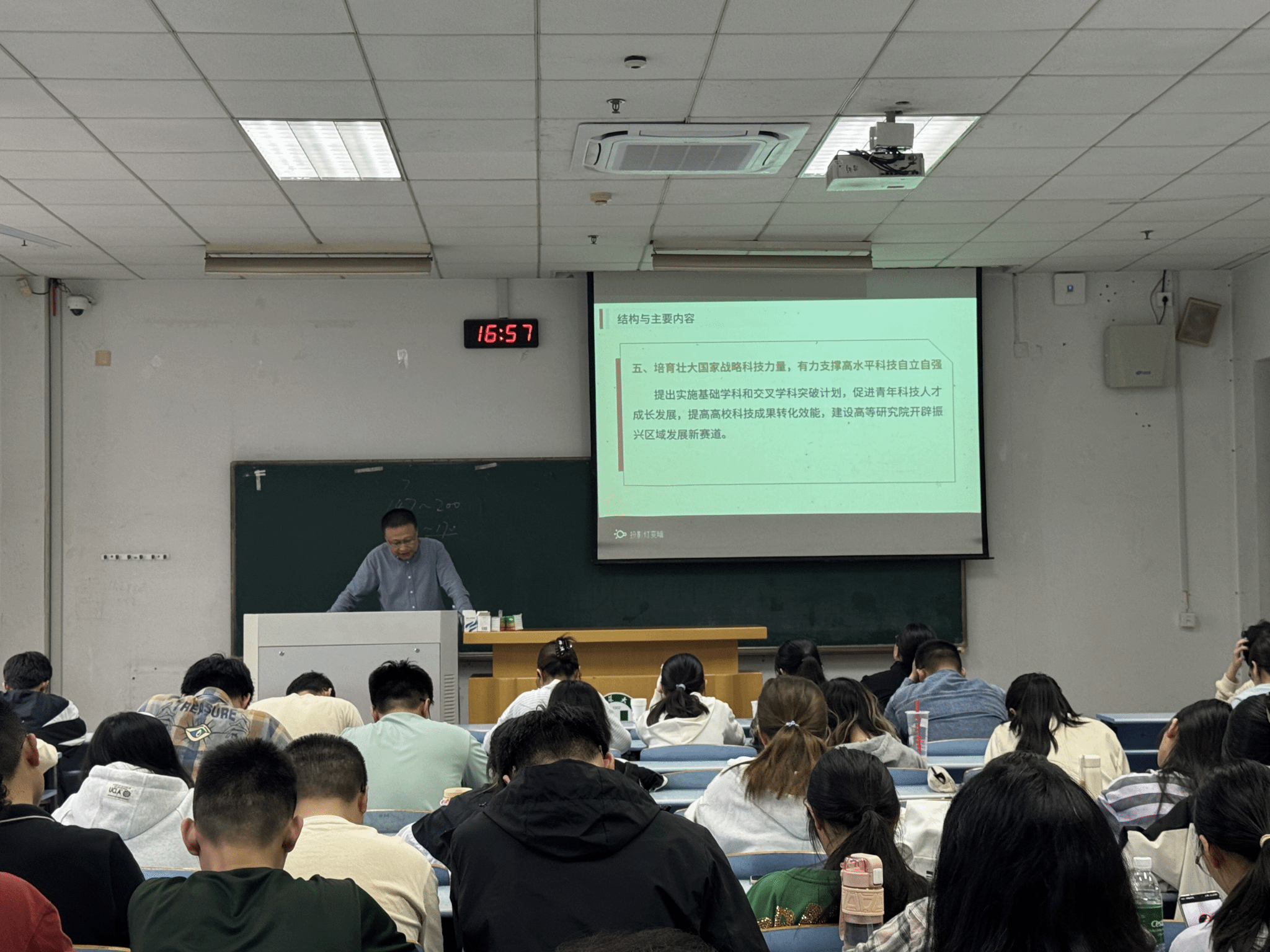 党委书记徐伟为大家讲解《教育强国建设规划纲要(2024-2025)》,活动由成人导航