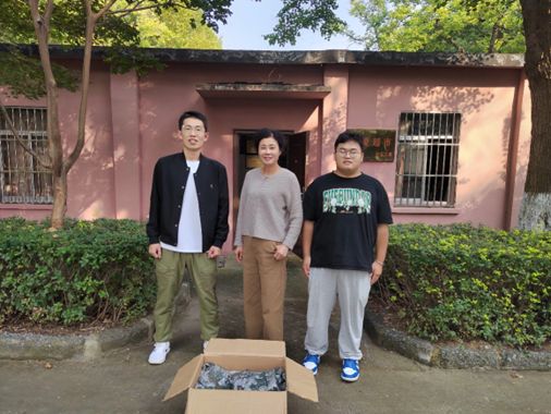 辅导员尹华、李健和学生志愿者杨仁把这批爱心物资送到校关爱超市值班老师的手中。